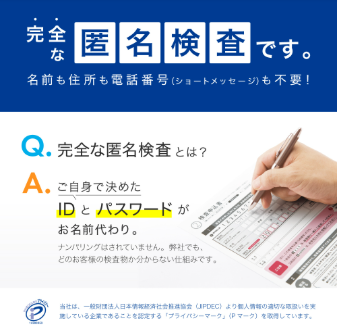 氏名ではなく、専用のIDを使って検査を行うため、誰にもあなたの情報が知られることはありません。